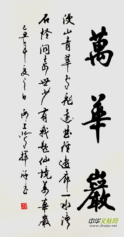 了解江鸟先生的人还知道他是一位学识宏博深通古诗词笔法的诗人。他的题画题词题书之句,多为自制诗句。情深意切,旷达潇洒,进退自适,言之有物。这在同辈的书家中是甚为难得的。江鸟先生有题《虎》句云:“威风惊鸟兽,豪气壮山林,昂首一声啸,震飞天上云。”势气雄伟,落笔有声,似金刚怒目,又如力士挥拳。细揣不仅寓意深厚贴切,而且笔力雄健,绝无造作之嫌。又有《精神》一首云:“高山大海育真魂,松有劲姿梅有芬。书画从来求气韵,人文自古重精神。”诗风高雅出尘,诗意恬淡请新。积极向上,毫无阿曲之气,再看韵律,也经得起推敲。如此佳句再配上风格独特的书法,两者融为一体,着实令观者耳目为之一新,精神为之一振。
