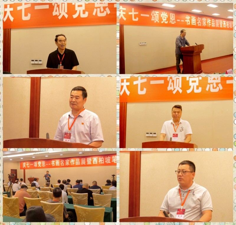 7月1日上午,书画展开幕式在西柏坡宾馆开幕。河北电视台王冉主持,西柏坡纪念馆副馆长李国强致欢迎辞,活动策展人靳新国、王海涛,组委会执行主任盖进波,军旅书法家杨廷欣,书画家周殿胜、叶建华、程文鸣和协办单位贾长彬等相继发言。
