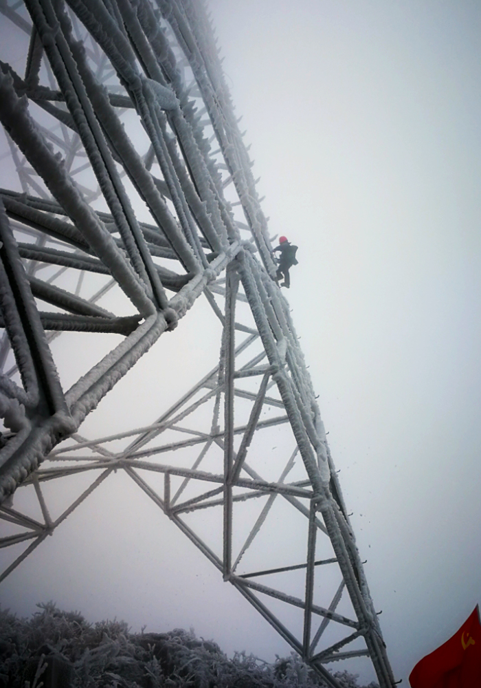 贵州电网运检分公司员工陈长生在遵义务川泥高乡220千伏石上线51号铁塔,边敲冰边上塔安装融冰短接线